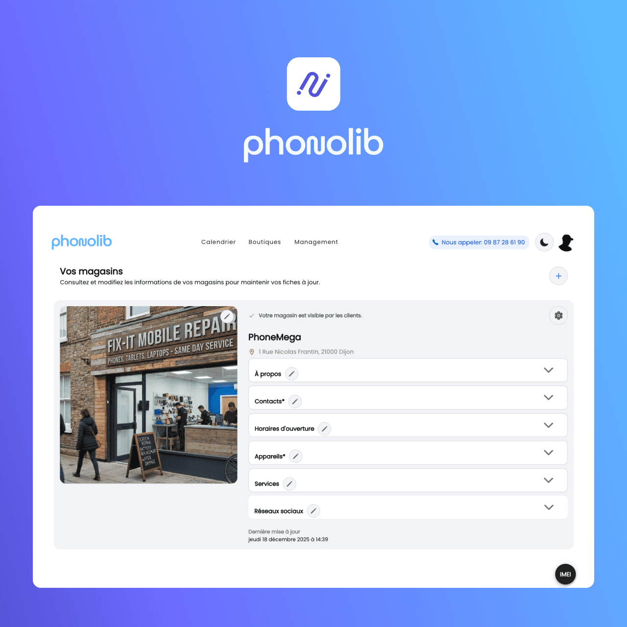 Phonolib simplifie la réparation. Trouvez un réparateur compétent pour une qualité garantie et des pièces fiables. Réservez en boutique ou à domicile (jour/nuit)
